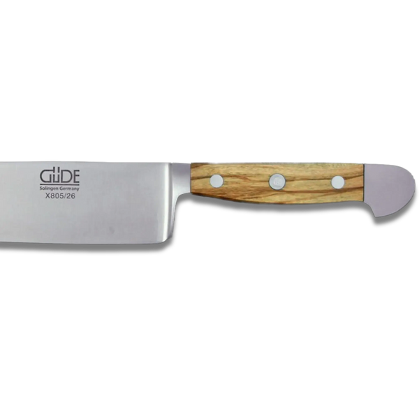The GÜDE Alpha Olive series chef's knife is an all-rounder. It easily cuts fish, meat, fruit, or vegetables. It is also suitable for chopping or weighing herbs. With the Gude chef's knife of the Alpha series, you can cut food with an exact cut. Thanks to the wide blade, you can easily pick up food that has been cut. A kitchen knife should not be missing in any kitchen.