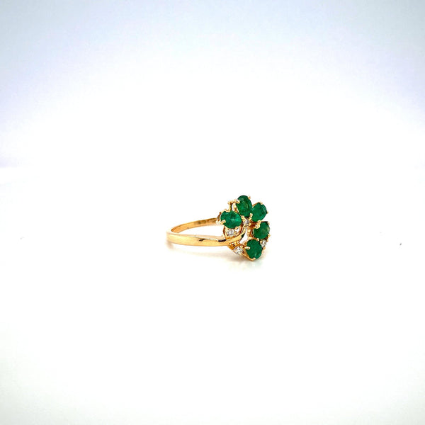 Emeralds and diamonds coming together set in 14K gold to form this statement ring that creates a buzz while being light on the hands.