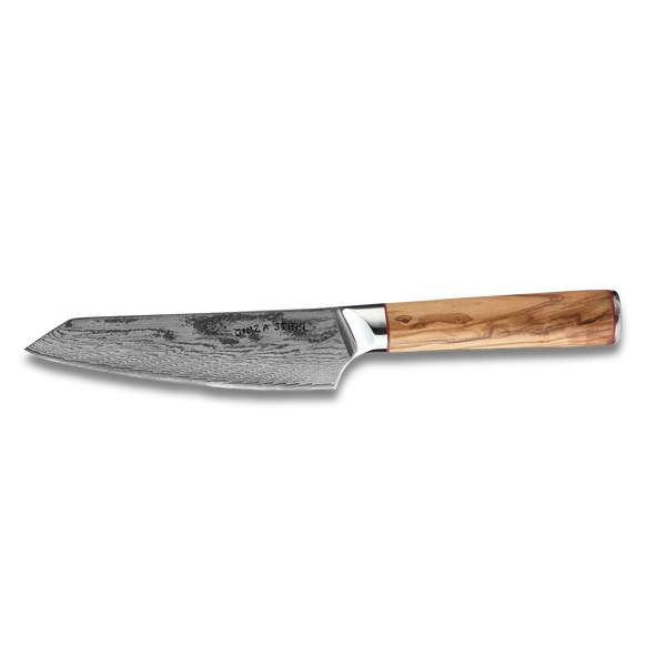 The Ginza Steel MIA 17 offers precision and durability with its 6.5” blade forged from 67 layers of Damascus AUS10 steel. The Italian olive wood handle adds elegance and a comfortable grip, making it perfect for detailed kitchen tasks.