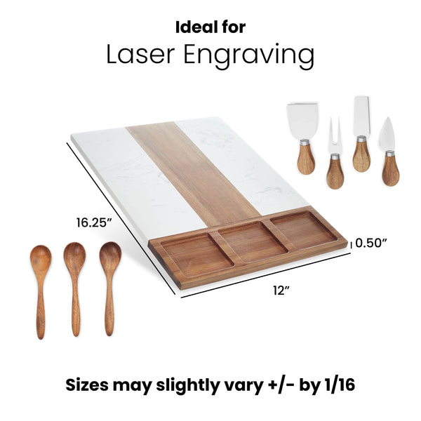 Introducing our Marble Charcuterie Serving Board Set, combining luxurious marble with premium acacia wood, renowned for its unique and beautiful grain patterns. Measuring 16.25 x 12 x 0.5, this 11-piece set includes three dipping spoons, three ceramic bowls, and four charcuterie utensils, providing everything you need for an exquisite spread. Each charcuterie board comes individually packaged in a white gift box with foam for safe transport.