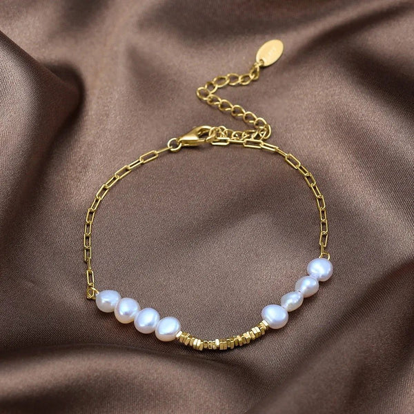 This baroque-inspired bracelet pairs lustrous freshwater pearls with a sleek paperclip chain, crafted from 925 sterling silver and finished in three layers of radiant 14K gold. Lightweight, refined, and effortlessly chic—perfect for adding modern luxury to your everyday look.